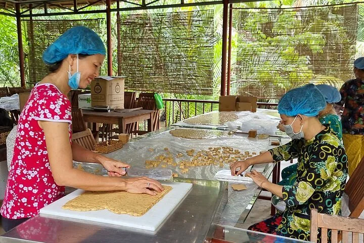 - 11:30–12:30: Ride a hand-rowed sampan through Tan Thach Canal. Visit a coconut candy mill and enjoy a peaceful rowing boat trip through small canals shaded by water coconut trees.